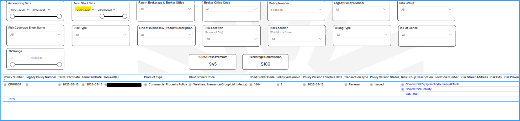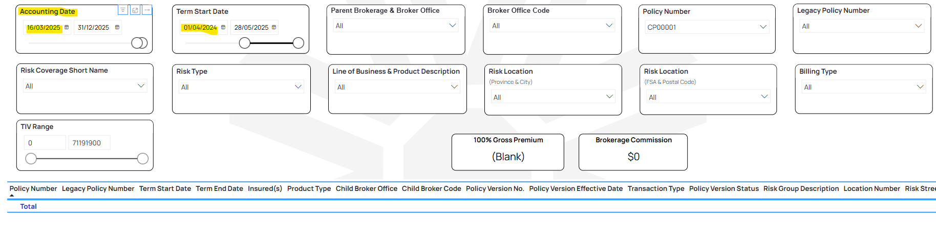 To focus solely on policies based on their Term Start Date (and avoid exclusions due to the Accounting Date), you can expand the Accounting Date filter to cover its full range. This ensures you're capturing all relevant policies from the selected Term Start Date range.